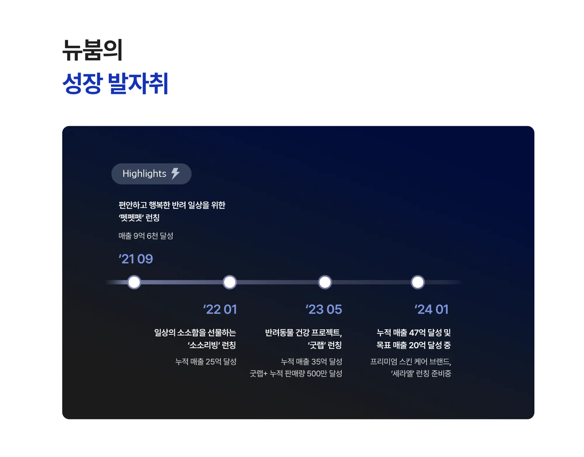 뉴붐은 2021년 이후 꾸준한 성장 발자취를 남기고 있습니다. 현재에 안주하기보단 새로운 도전을 꾀하며 매년 새로운 브랜드를 런칭함으로써 빠르게 성장하고 있음과 동시에, 지속적인 품질 업그레이드, 카테고리 확장 등으로 고객들에게 많은 사랑을 받고 있습니다.